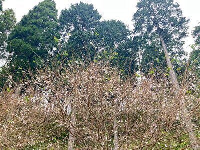 十月桜とは、春と秋と2回咲き、春のような満開の桜のようには咲きませんが、しろ、ピンクの小さなお花が可愛く咲きます。秋は10月~12月頃まで少しずつ咲き、11月には、もみじの紅葉とコラボも楽しめます!